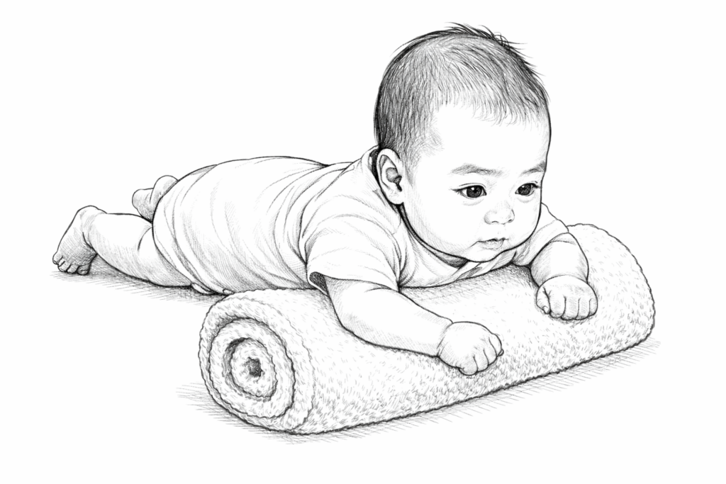 クッションやタオルを使って、完全なうつ伏せではなく、少し角度をつけると負担が減ります。また、脇の下にロール上のタオルを入れる事で、腕で支えながら頭を上げる事に繋がりやすくなります。